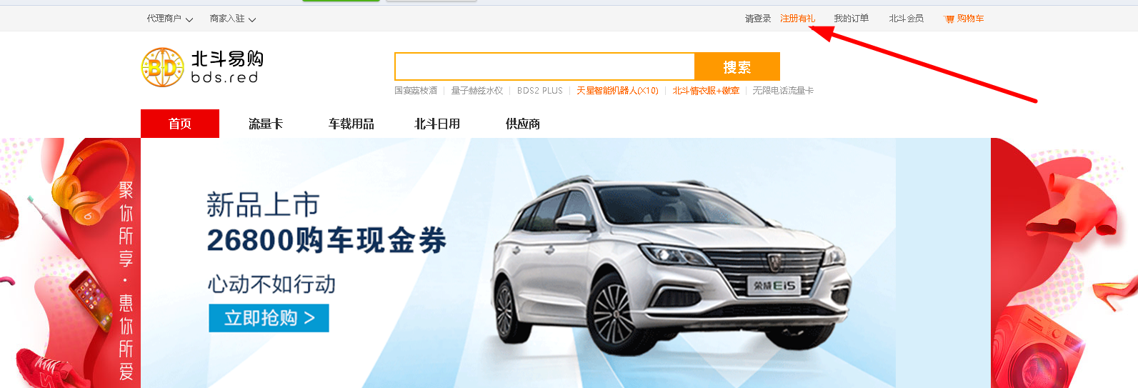 2、 页面进入以后显示北斗易购首页,新会员需在右上角点击注册有礼按提示注册,北斗app会员可直接点击登录。