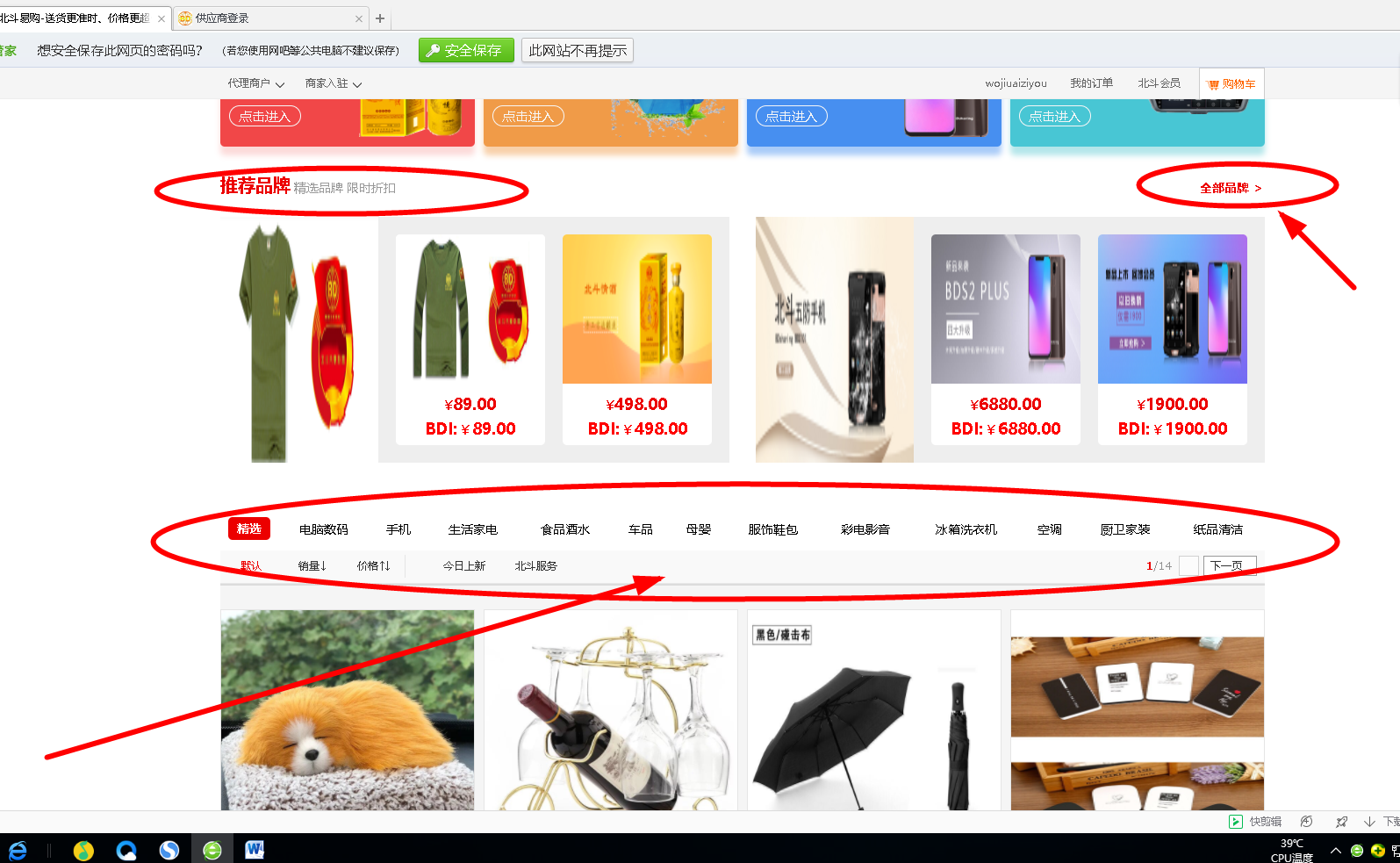 4、 首页下方有北斗易购推荐品牌、精选品牌以及限时折扣商品,会员也可以点击各商品大类挑选心仪产品。