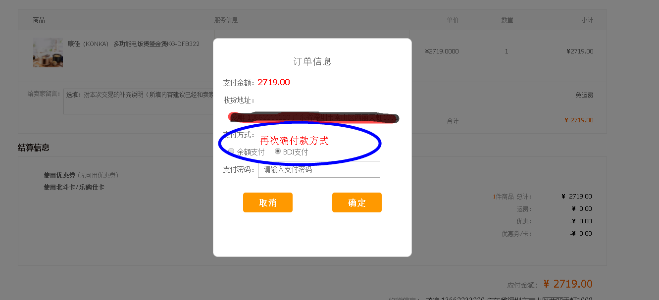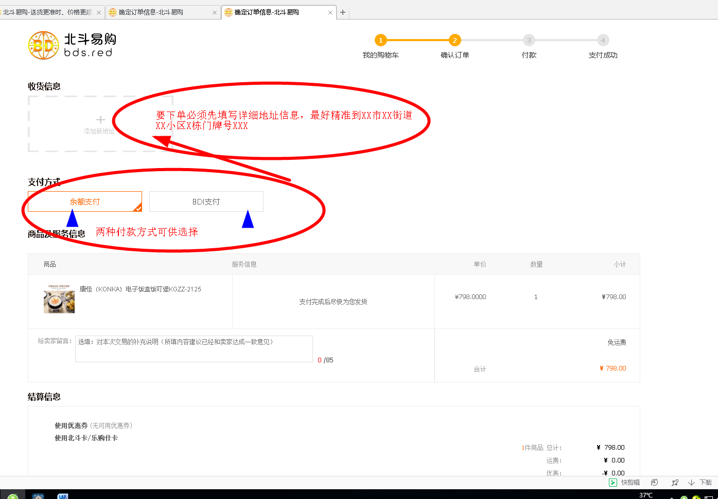 6、 确认订单后需完善各项收货信息,确认信息无误后在下方支付方式中可选择余额支付或BDI后将进入付款页面
